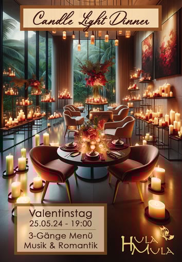 Verpasse nicht die Gelegenheit, bei Kerzenschein und wunderbarer Musik in den Genuss unseres speziellen Menüs zu kommen. Reserviere deinen Tisch frühzeitig und freue dich auf einen Abend voller Romantik, Genuss und Musik!