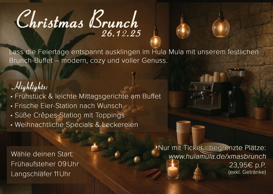 Die Plätze sind begrenzt, sichere dir jetzt dein Ticket und freue dich auf einen genussvollen Christmas Brunch im Hula Mula:
